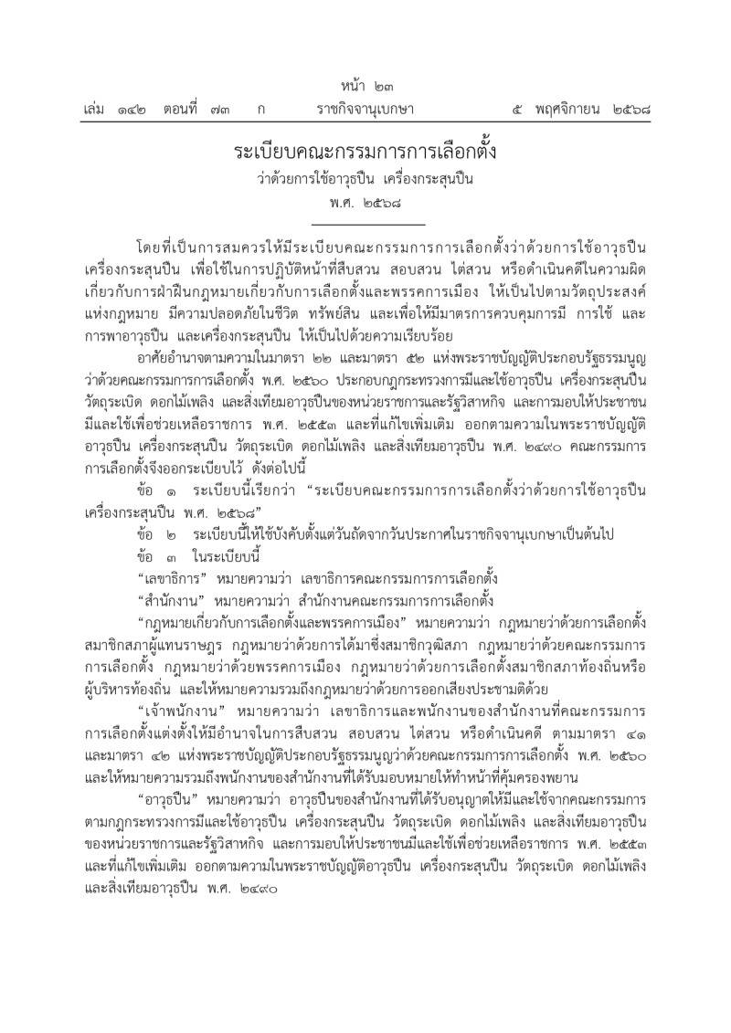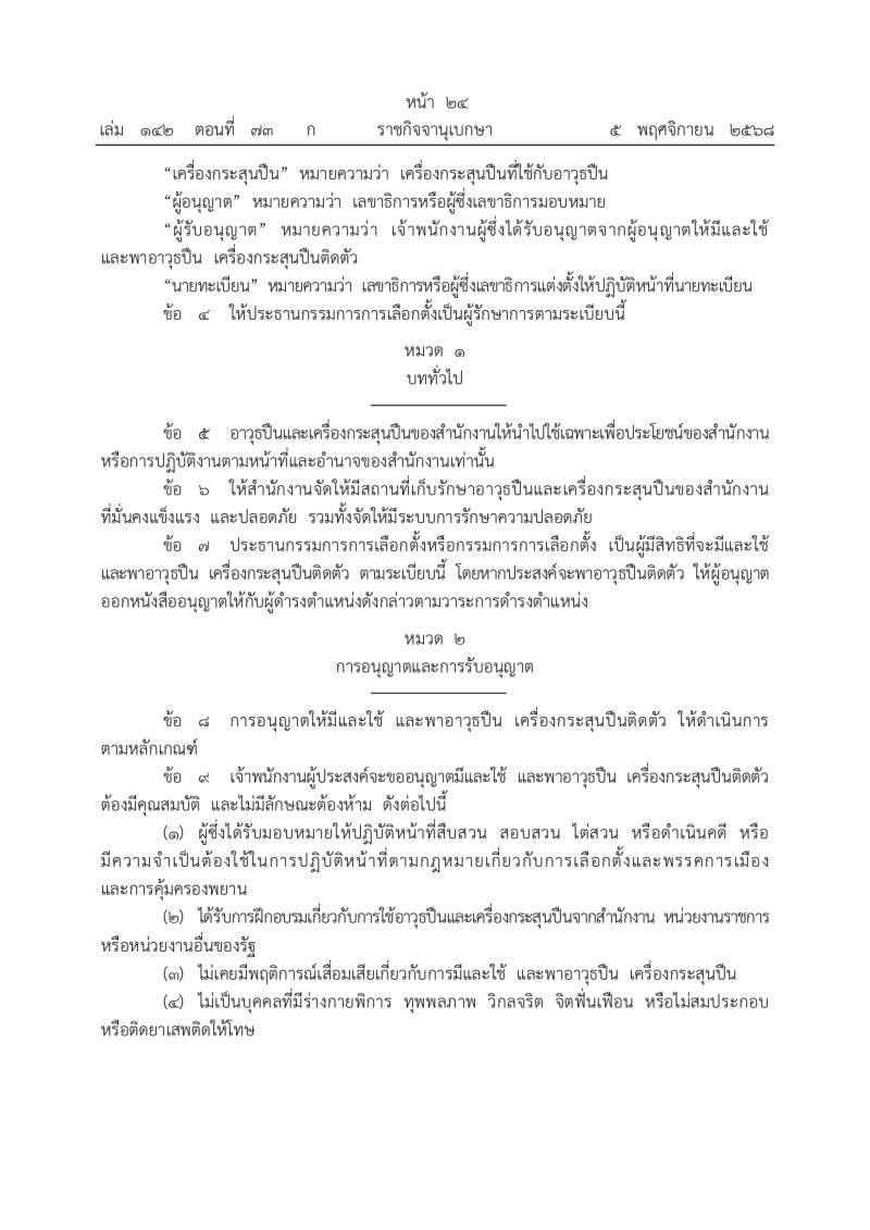 เมื่อวันที่ 6 พฤศจิกายน 2568 เว็บไซต์ ราชกิจจานุเบกษา เผยแพร่ประกาศ ระเบียบคณะกรรมการการเลือกตั้งว่าด้วยการใช้อาวุธปืน เครื่องกระสุนปืน พ.ศ. 2568 โดยมีใจความว่า