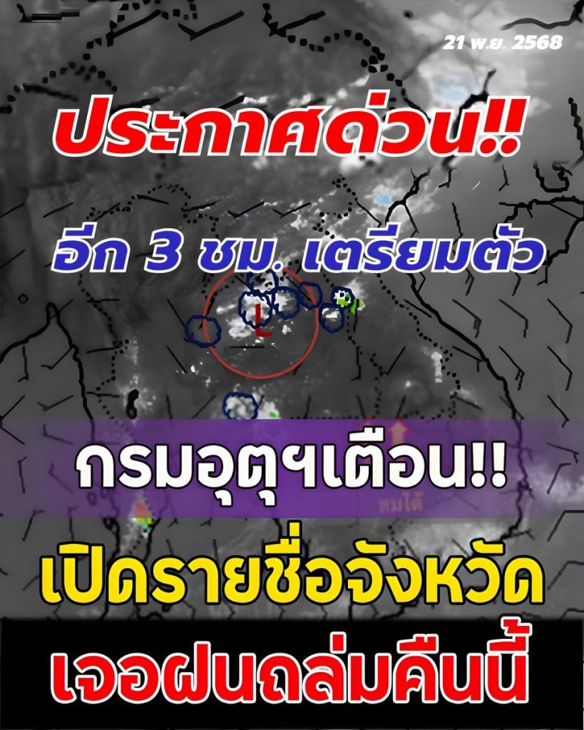 21 พฤศจิกายน 2568 พยากรณ์อากาศ 24 ชั่วโมงข้างหน้า ภาคเหนือและภาคตะวันออกเฉียงเหนือ มีอากาศเย็นถึงหนาว ส่วนภาคกลาง รวมทั้งกรุงเทพมหานครและปริมณฑล และภาคตะวันออก มีอากาศเย็น ขอให้ประชาชนในบริเวณดังกล่าวดูแลรักษาสุขภาพ เนื่องจากสภาพอากาศที่หนาวเย็นกับมีลมแรง สำหรับเกษตรกรควรป้องกันและระวังความเสียหายที่จะเกิดต่อผลผลิตทางการเกษตรไว้ด้วย ส่วนประชาชนบริเวณภาคตะวันออกเฉียงเหนือระวังอันตรายจากอัคคีภัยเนื่องจากสภาพอากาศที่แห้งและมีลมแรง ทั้งนี้เนื่องจากบริเวณความกดอากาศสูงหรือมวลอากาศเย็นกำลังแรงจากประเทศจีนแผ่ปกคลุมประเทศไทยตอนบนและภาคใต้ตอนบน