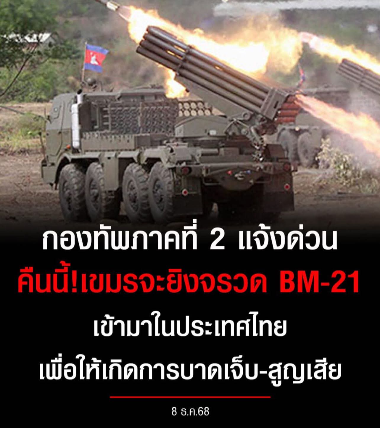 ล่าสุดเพจกองทัพภาคที่ 2 ได้รับแจ้งจากแหล่งข่าวที่เชื่อถือได้ คืนนี้! กัมพูชาจะใช้จรวดหลายลำกล้อง (BM-21) ทำการยิงเข้ามายังดินแดนไทยเพื่อทำให้เกิดการบาดเจ็บและสูญเสียในชีวิตและทรัพย์สินโดยอาศัยห้วงเวลากลางคืนที่ยากต่อการตรวจการณ์และยังทำให้เกิดการตื่นตระหนกต่อประชาชนในพื้นที่ชายแดนกองทัพภาคที่ 2 จะยับยั้ง ป้องกัน และตอบโต้ภัยคุกคามนี้อย่างหนักหน่วงและเต็มขีดความสามารถ จึงขอให้ประชาชนอยู่ในที่ปลอดภัยและรับฟังการแจ้งเตือนข่าวสารจากหน่วยงานราชการในโอกาสต่อไป #กัมพูชายิงก่อน #CambodiaOpenFire #สันติภาพไม่มีอยู่จริง