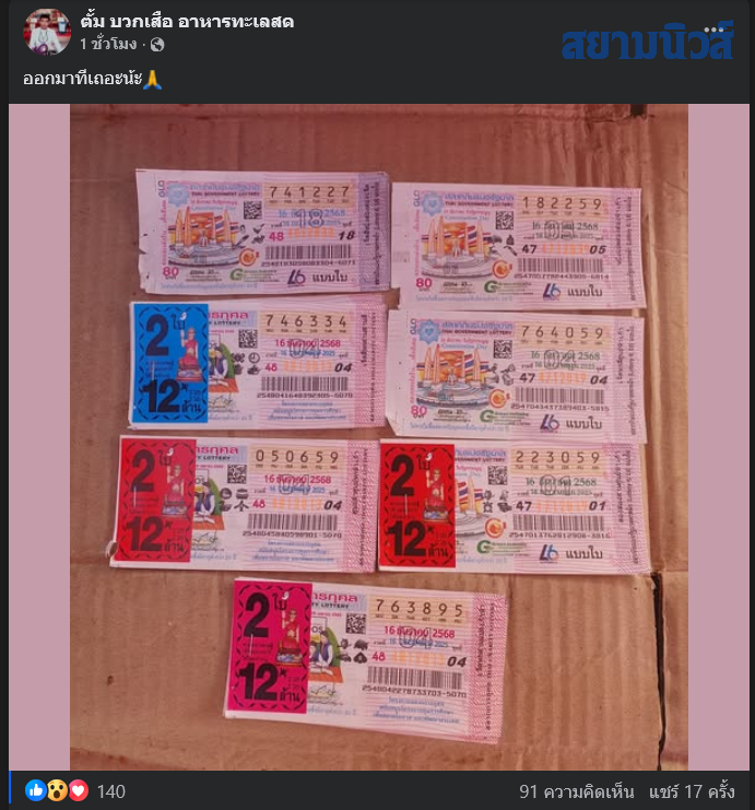 ล่าสุดจากการตรวจสอบโลกออนไลน์พบว่าผู้ใช้เฟซบุ๊กรายหนึ่งได้โพสต์ภาพลอตเตอรี่จำนวนหลายใบซึ่งหนึ่งในนั้นมีเลขรางวัลที่ 1 จำนวน 2 ใบ พร้อมระบุข้อความว่า ออกมาทีเถอะน้ะ โดยหนุ่มรายดังกล่าวเป็นพ่อค้าขายอาหารทะเลสด