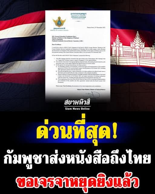 โดยในหนังสือระบุว่า ข้าพเจ้าขออ้างถึงแถลงการณ์ของประธานอาเซียนเกี่ยวกับการประชุมรัฐมนตรีต่างประเทศอาเซียนพิเศษว่าด้วยสถานการณ์ปัจจุบันระหว่างกัมพูชาและไทย เมื่อวันที่ 22 ธันวาคม 2568 ณ กรุงกัวลาลัมเปอร์ ซึ่งแสดงความยินดีต่อการหารือเกี่ยวกับการกลับมาเจรจาหยุดยิงและยุติการสู้รบ ในเรื่องนี้ กัมพูชาเห็นด้วยกับการประชุมคณะกรรมการชายแดนทั่วไป (GBC) ที่เสนอให้จัดขึ้นในวันที่ 24 ธันวาคม 2568