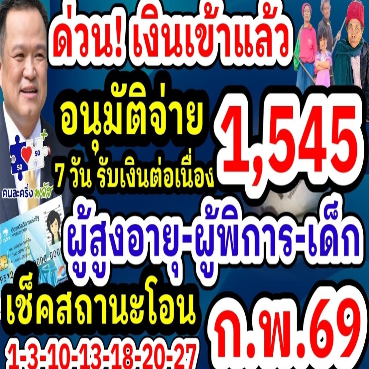 เงินได้ถูกโอนเข้าบัญชีแล้ว มีการจ่ายเงินผ่านบัตรสวัสดิการทั่วประเทศ ผู้สูงอายุ ผู้พิการ..