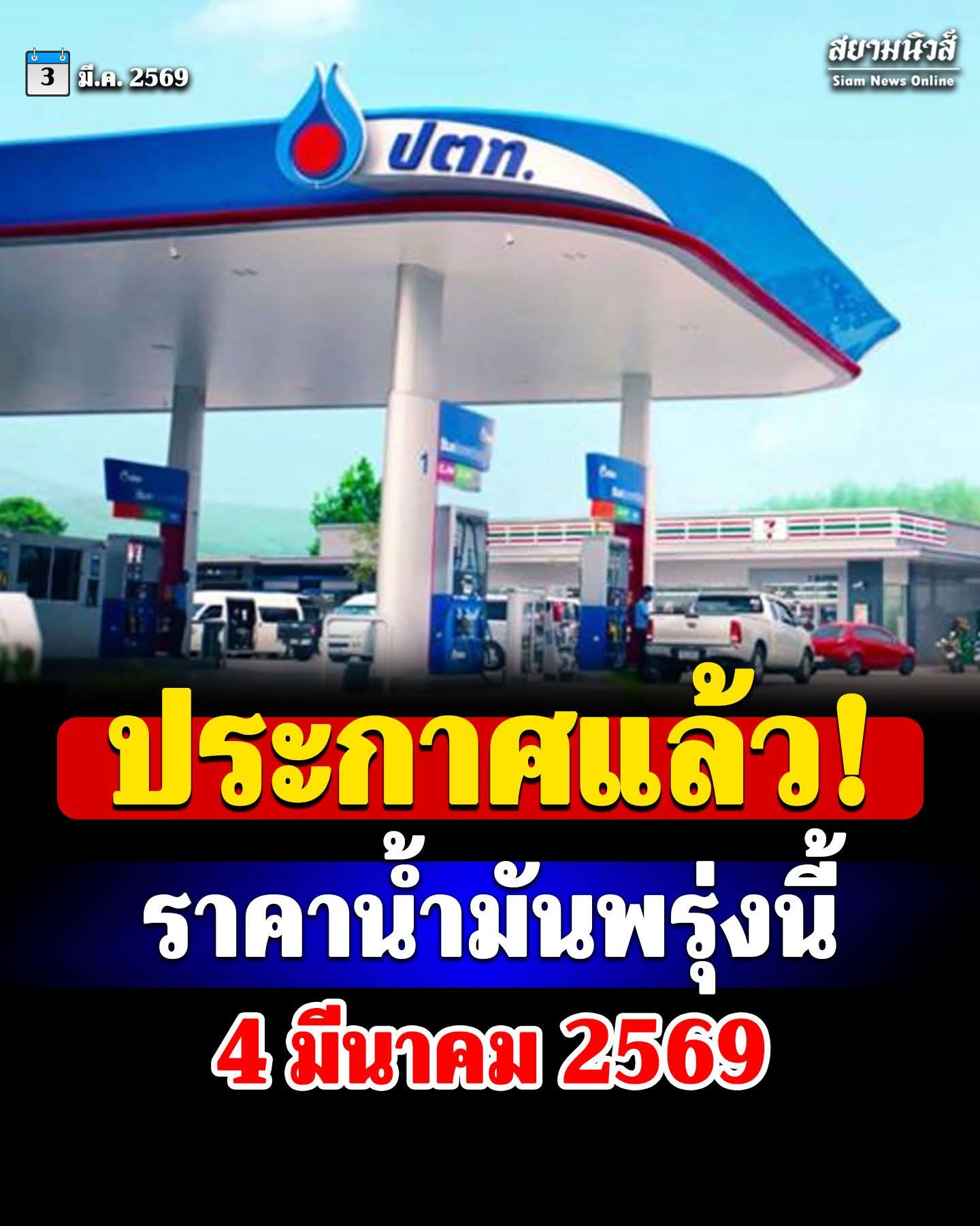May be an image of text that says '3 มี.ค.2 มี.ค. 2569 สยามนิวส์ Siam News SiamNewsOnline Online ปตท. ประกาศแล้ว! ระกาศเแ ศแล้ว! ราคาน้ำมันพรุ่งนี้ ราคาน้ำมัน รุ่งนี้ 4 มีนาคม2569 มีนาคม 2569'