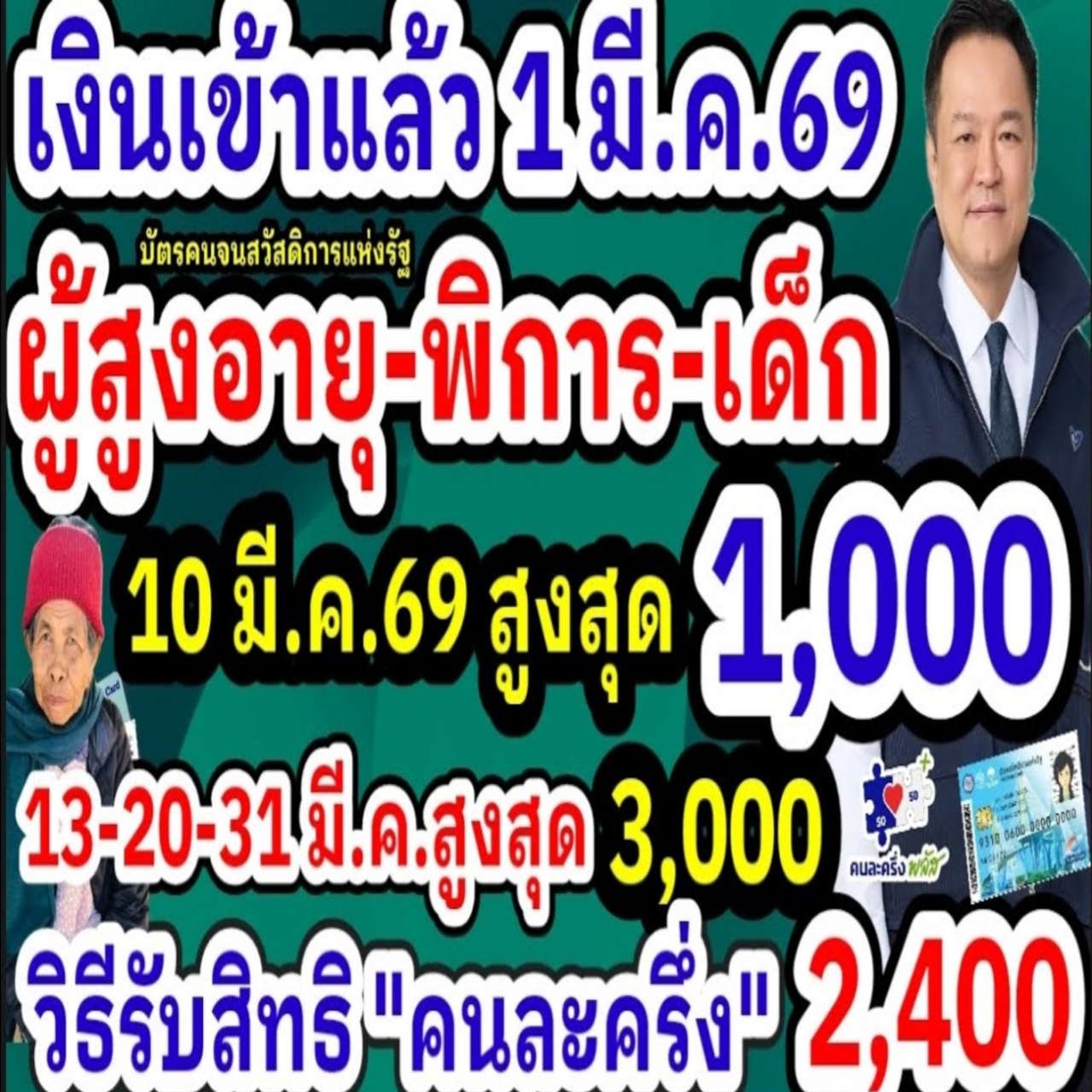 เงินเข้าแล้ว กรมบัญชีกลางโอนเงินแล้ว 1 มีนาคม 69 บัตรคนจนจ่ายต่อเนื่อง 5วัน ผู้สูงอายุ พิการ เด็ก
