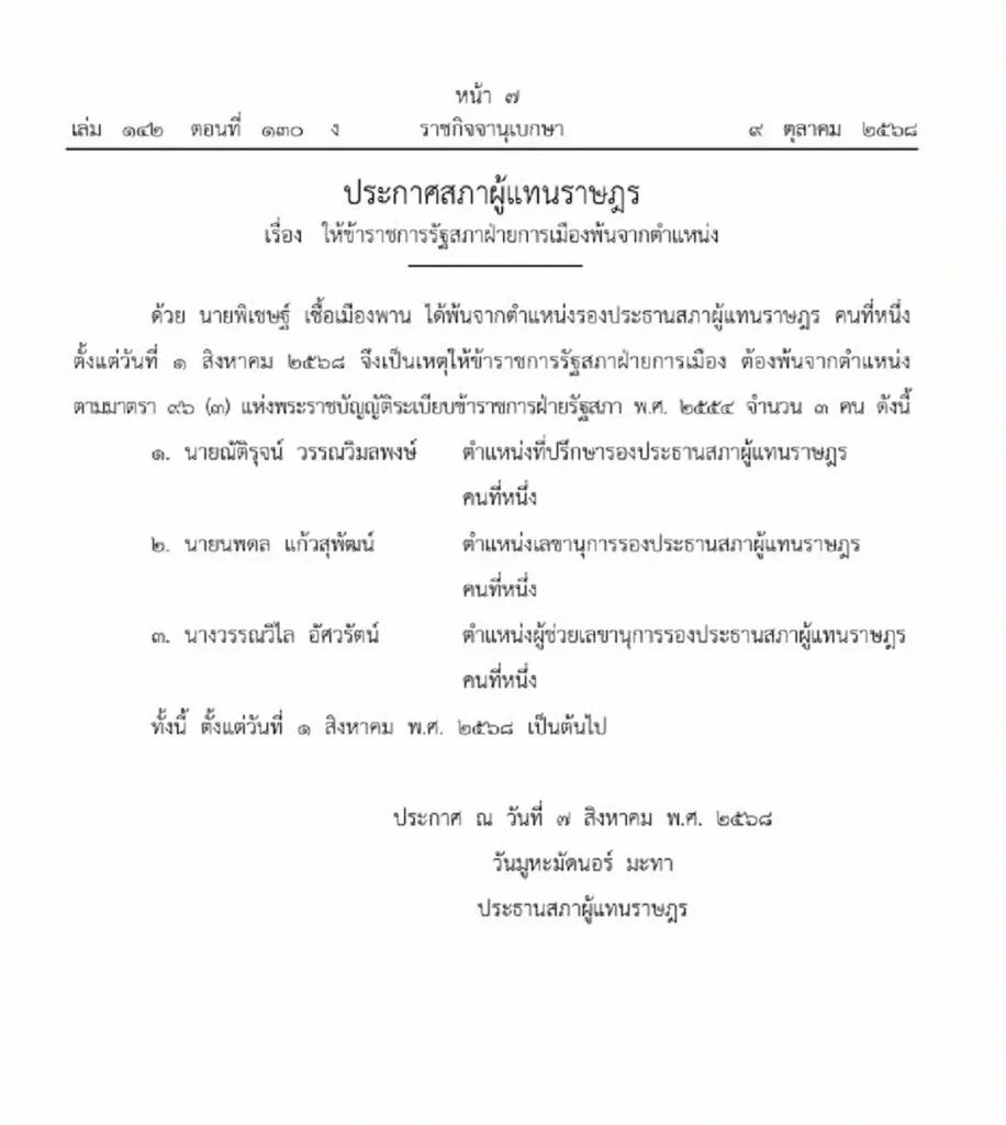 ด้วย นายพิเชษฐ์ เชื้อเมืองพาน ได้พ้นจากตำแหน่งรองประธานสภาผู้แทนราษฎร คนที่หนึ่ง ตั้งแต่วันที่ 1 สิงหาคม 2568 จึงเป็นเหตุให้ข้าราชการรัฐสภาฝ่ายการเมือง ต้องพ้นจากตำแหน่ง ตามมาตรา 96 (3) แห่งพระราชบัญญัติระเบียบข้าราชการฝ่ายรัฐสภา พ.ศ. 2554 จำนวน 3 คน ดังนี้