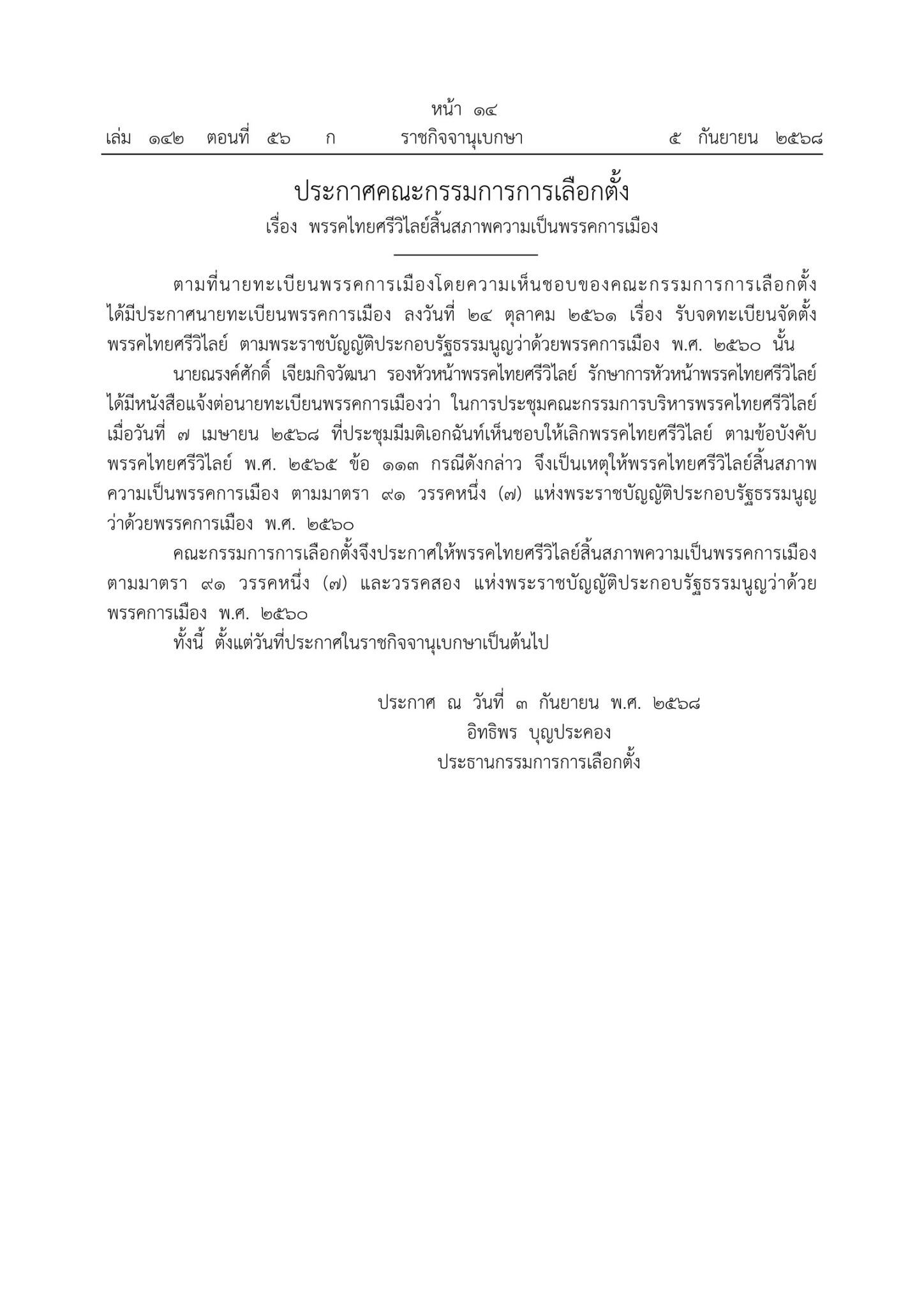 เมื่อวันที่ 6 ก.ย. เว็บไซต์ ราชกิจจานุเบกษา เผยแพร่ ประกาศคณะกรรมการการเลือกตั้ง (กกต.) เรื่อง พรรคไทยศรีวิไลย์สิ้นสภาพความเป็นพรรคการเมือง