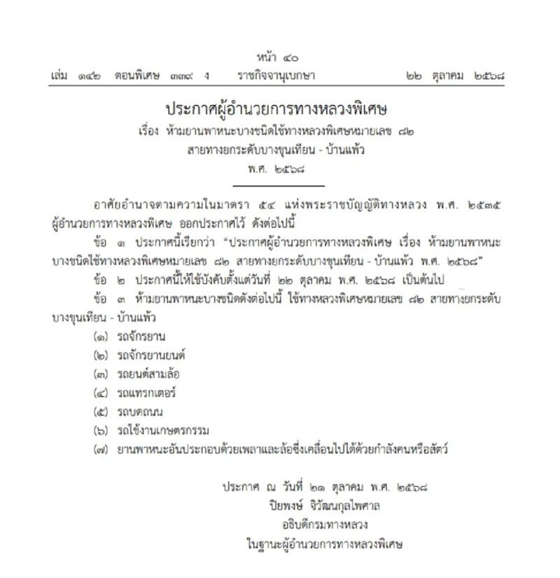 วันที่ 30 ตุลาคม พ.ศ. 2568 เว็บไซต์ราชกิจจานุเบกษา เผยแพร่ประกาศของผู้อำนวยการทางหลวงพิเศษ เรื่อง ห้ามยานพาหนะบางชนิดใช้ ทางหลวงพิเศษหมายเลข 82 (มอเตอร์เวย์ M82) สายทางยกระดับบางขุนเทียน – บ้านแพ้ว พ.ศ. 2568
